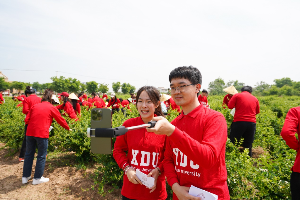 正值“立夏”剛過不久,美麗的金銀花田景色宜人、生機盎然。在駐村第一書記韋帥的指導下,現場的同學們先是學習金銀花采摘方法,隨后分成小組、手持收納袋、認領責任田,擼起袖子開始了金銀花的“掐尖兒”工作。炎炎烈日下,身穿紅色“XDU”文化衫的西電學子忙碌的身影灑滿了綠色田野,形成一副美麗的鄉村勞作畫卷。