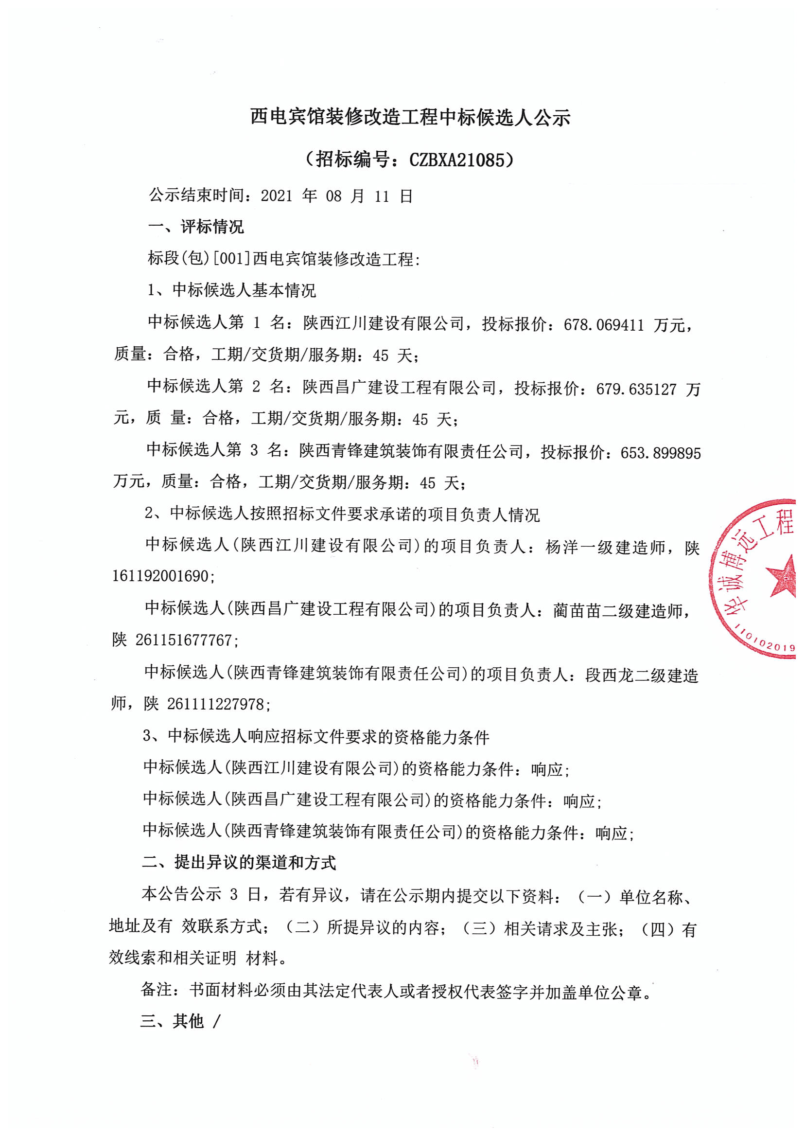 西電賓館裝修改造工程中標候選人公示